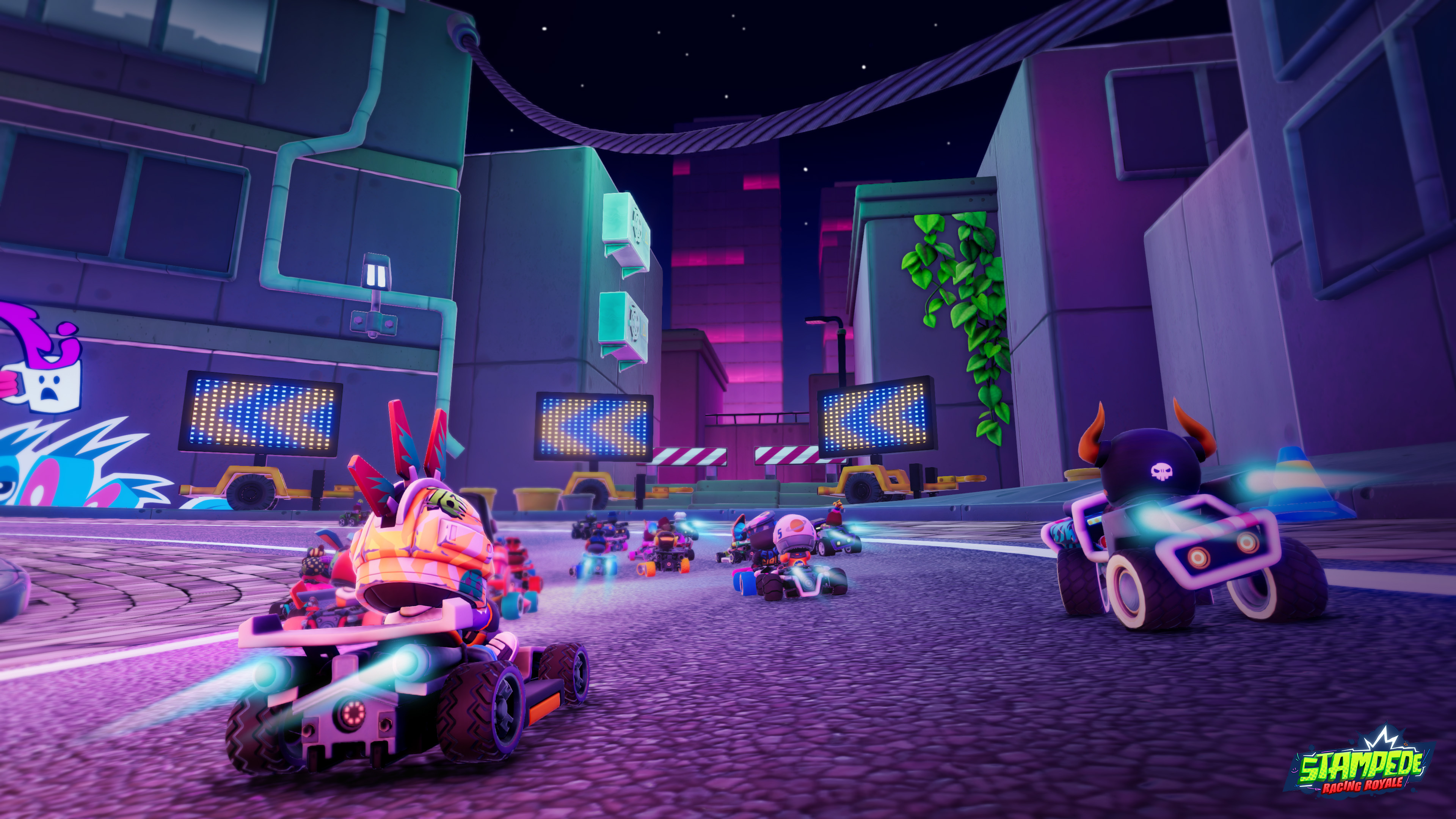 Stampede Racing Royale is an exhilarating battle royale racing game where 60 players compete in chaotic, physics-based races across vibrant tracks. Outwit and outmaneuver your opponents using power-ups and unique kart abilities to be the last one standing.